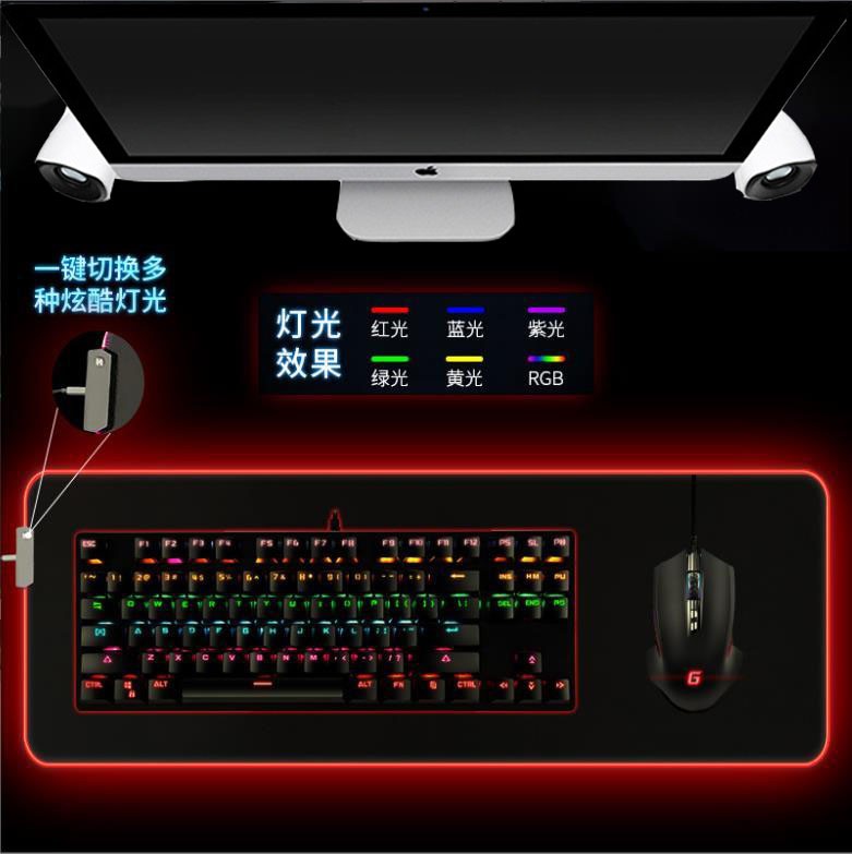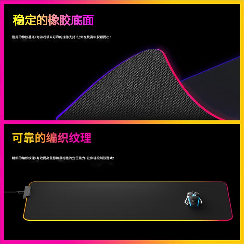 炫彩RGB游戲鼠標墊,織物面料編織,表面細膩、平整、操作穩(wěn)定,帶燈光切換按鍵,輕輕一按,燈光可自由切換,加厚橡膠底部,穩(wěn)固防滑